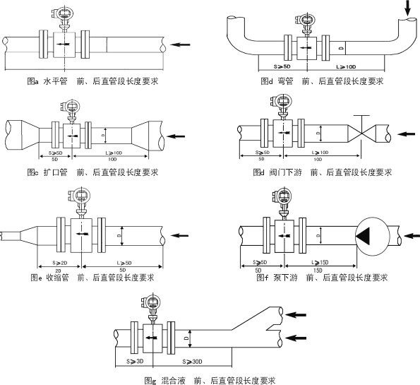 技術人員在安裝流量計時,都需要準確得到計量設備對前后直管的詳細長度長度要求,而目前多數(shù)流量計生產廠家都注意到了這一點,進而滿足了這方面的要求,在流量計的出場說明書上強調了流量計對前后直管的長度。